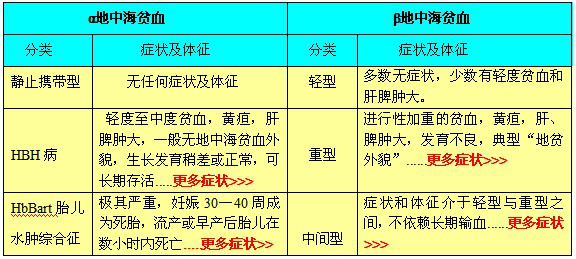 地中海贫血症的分类不同,临床症状表现也有很大的不同,因此,临床诊疗过程中,不同的症状表现成为地中海贫血症诊断的较重要依据。具体的分类、症状表现如下图。