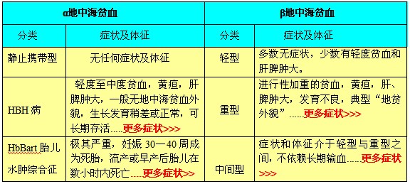 地中海贫血症的分类不同,临床症状表现也有很大的不同,因此,临床诊疗过程中,不同的症状表现成为地中海贫血症诊断的重要依据。具体的分类、症状表现如下图。