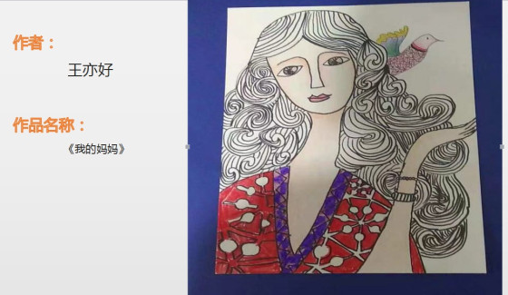 这幅作品主题为《我的妈妈》的绘画作品,画出了妈妈在孩子心目中的形象,美丽,大方,自然。妈妈,是孩子心目中最美的存在,这位小朋友用画描绘出妈妈的样子,表达对妈妈最美的爱意。