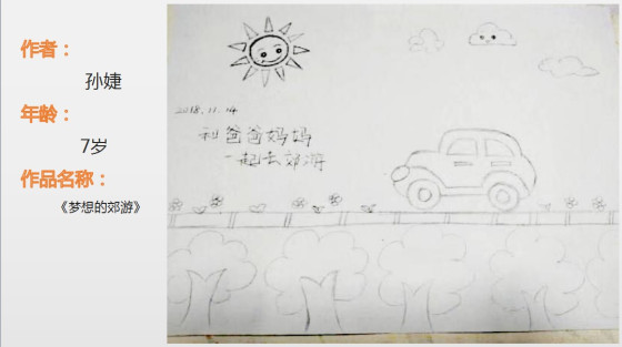 7岁的小患者孙婕,已经很久没有去看看外面的世界,她的时间大部分在医院病房里度过。用笔描绘出自己渴望的郊游时光,希望身体赶快好起来,和爸爸妈妈一起去郊游,去看看外面的世界。
