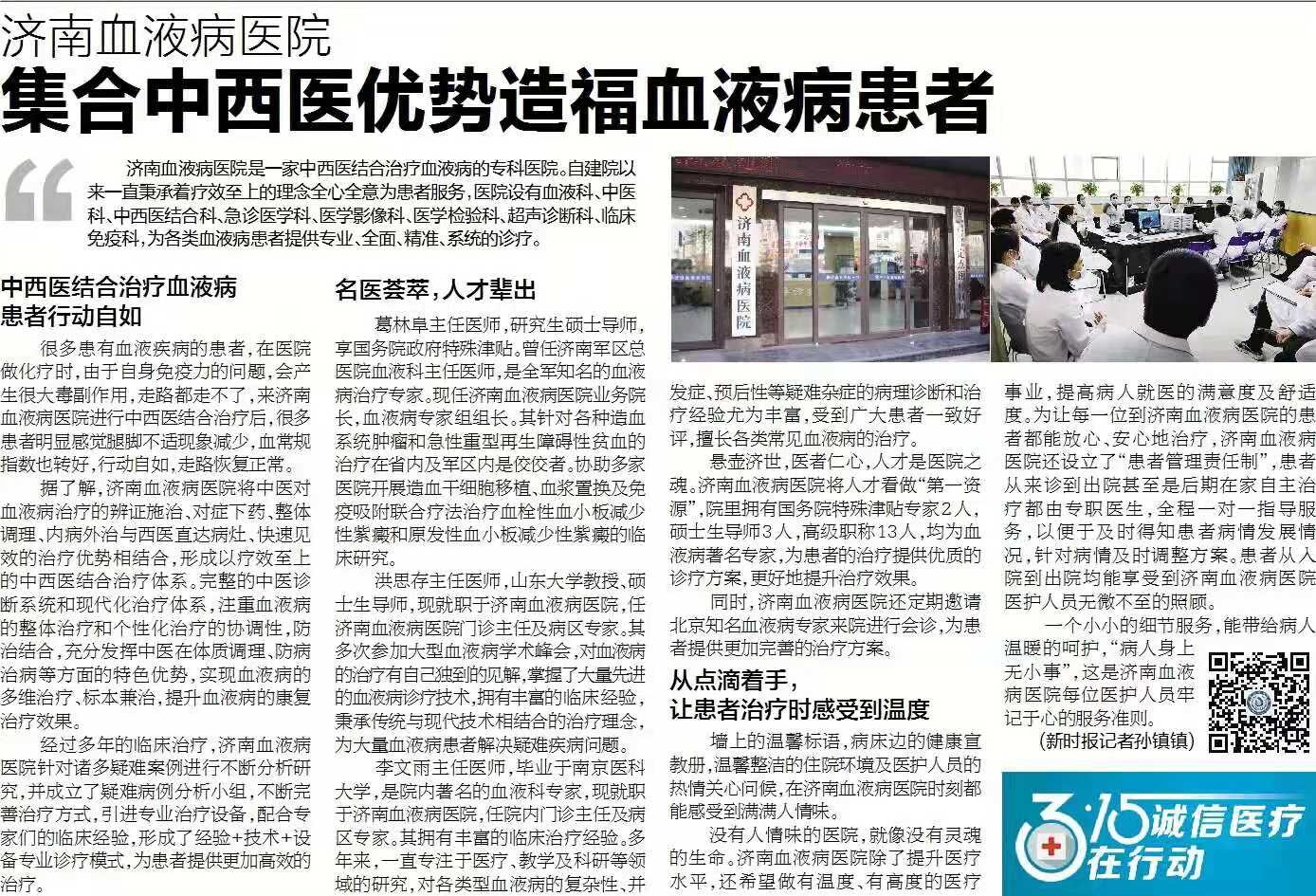 今天(2021年3月11日),《济南时报》用半个版面的篇幅报道了济南血液病医院,题目是《济南血液病医院集合中西医优势造福血液病患者》。