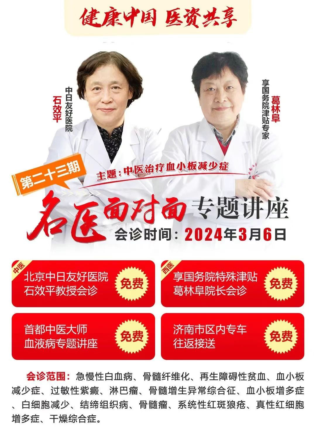 北京时间2024年3月6日 北京中日友好医院石效平教授受邀做客济南血液病医院第二十三期《名医面对面》专题讲座+中西医结合联合会诊活动。