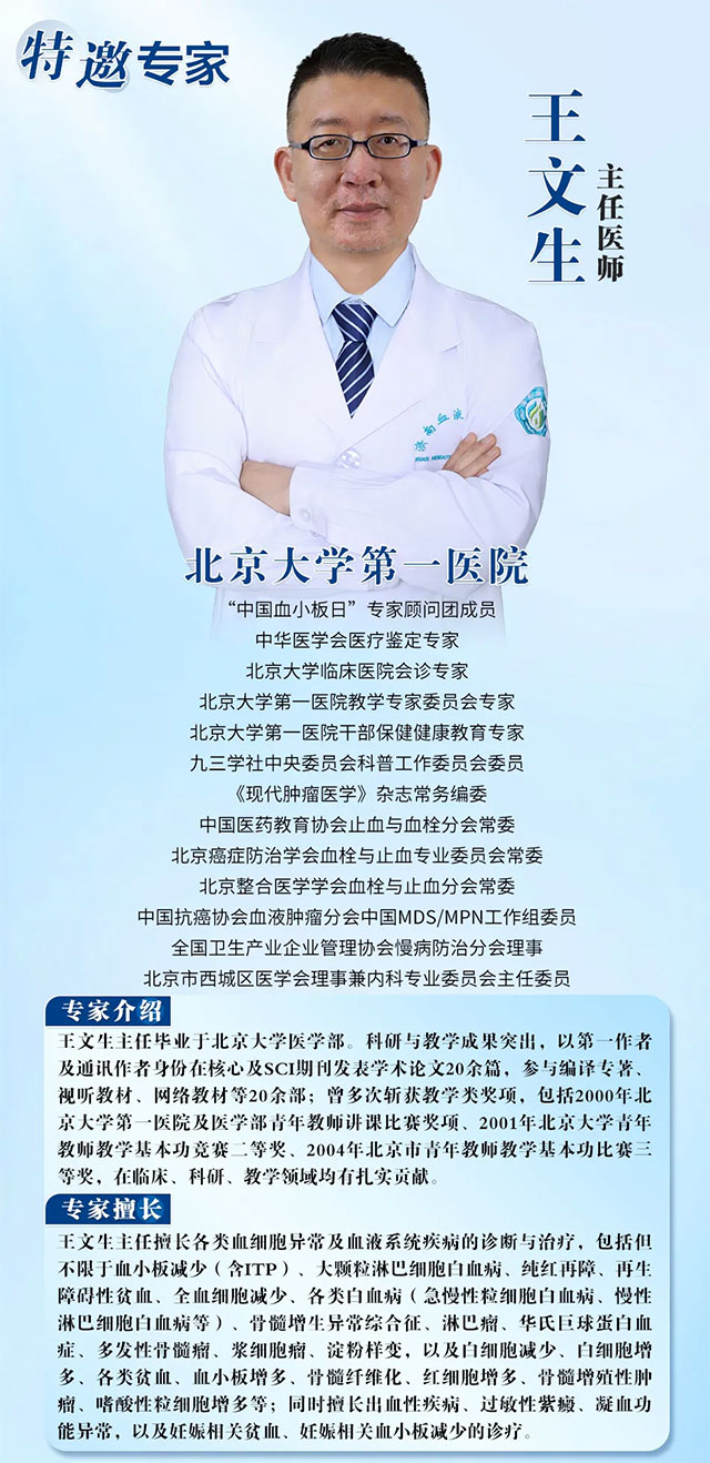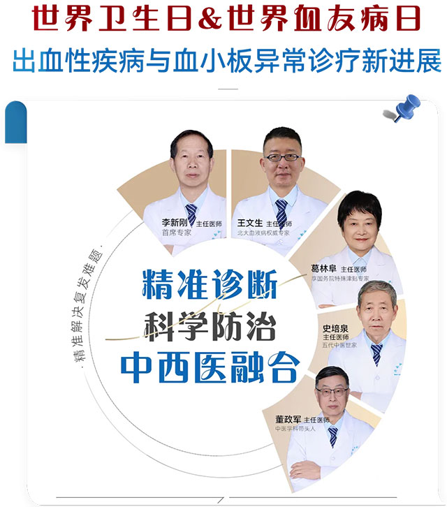 在此背景下,济南血液病医院特别邀请北京大学第一医院王文生主任(4月4日领衔)、史培泉主任(4月3日联合),携手我院享国务院特殊津贴专家葛林阜院长、国内血液病权威专家李新刚主任,北京中医药大学董政军主任开展出血性疾病与血小板异常专项联合会诊,为患者提供权威、精准、个体化的中西医结合诊疗方案。