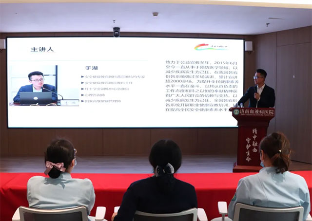 白衣为甲,坚守一线,医护人员始终以专业与担当守护着患者的生命健康,而长期高强度、高压力的工作状态,也让颈肩腰椎劳损、心脑血管疾病、职业疲劳等问题,成为困扰医护群体的常见健康隐患。为切实关注全院医护人员身心健康,提升健康防护意识与应急急救能力,有效预防职业病、心脑血管等高发健康问题,2026年4月8日,济南血液病医院特邀安全健康教育网山东站宣教办主任于湖,开展《关爱医护 健康同行》健康专题讲座,为坚守岗位的白衣战士送上专业且实用的健康守护。